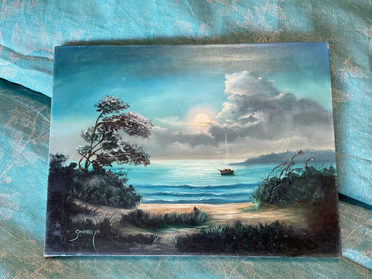 Vintage Barbazon Moonlit Beach Oil Painting Signed