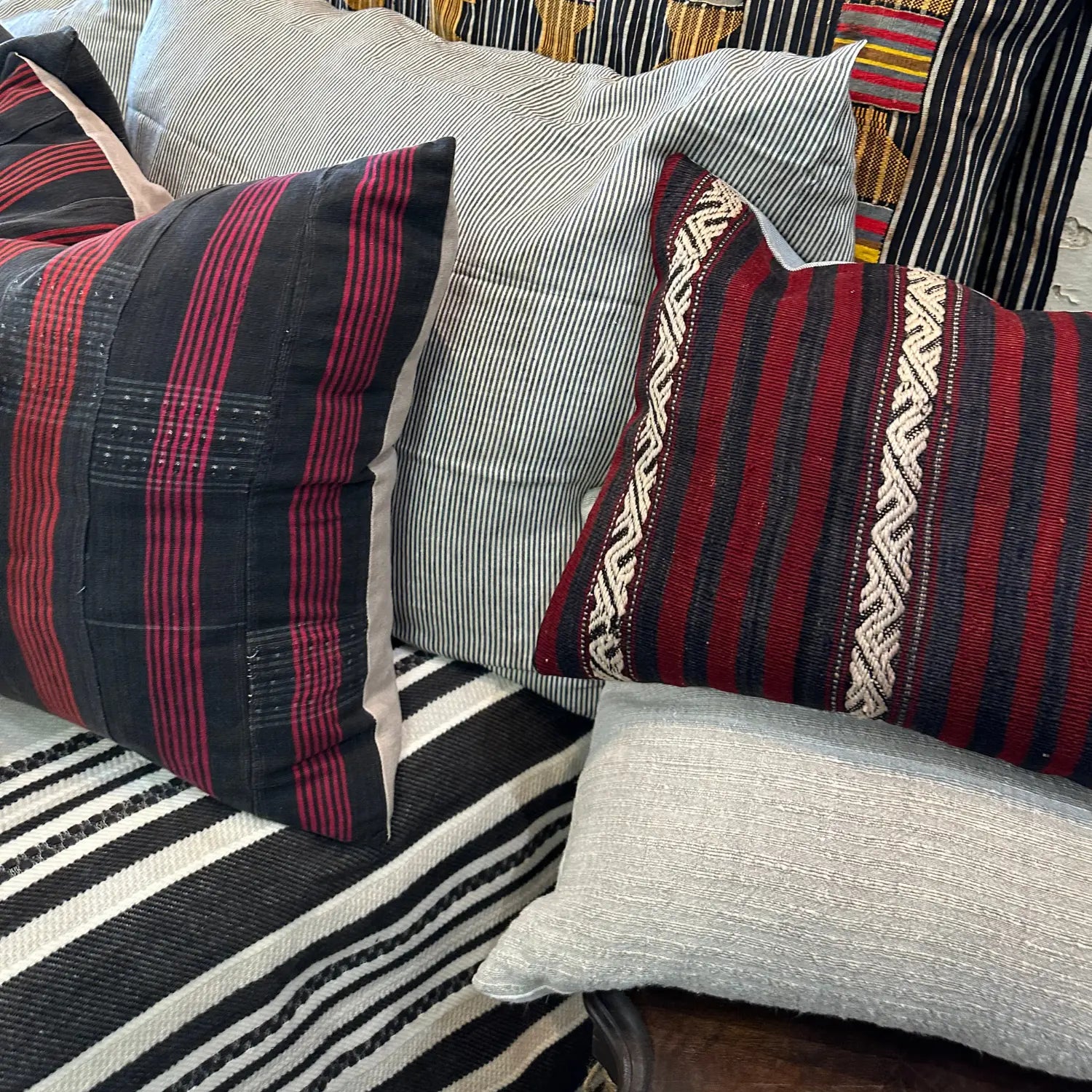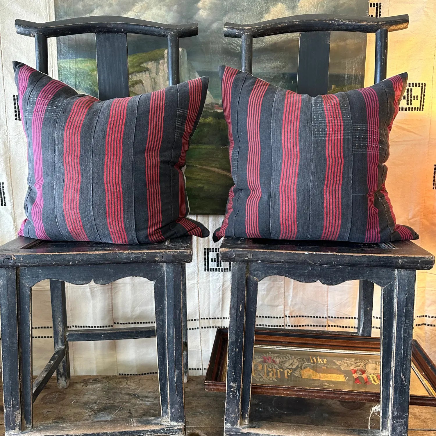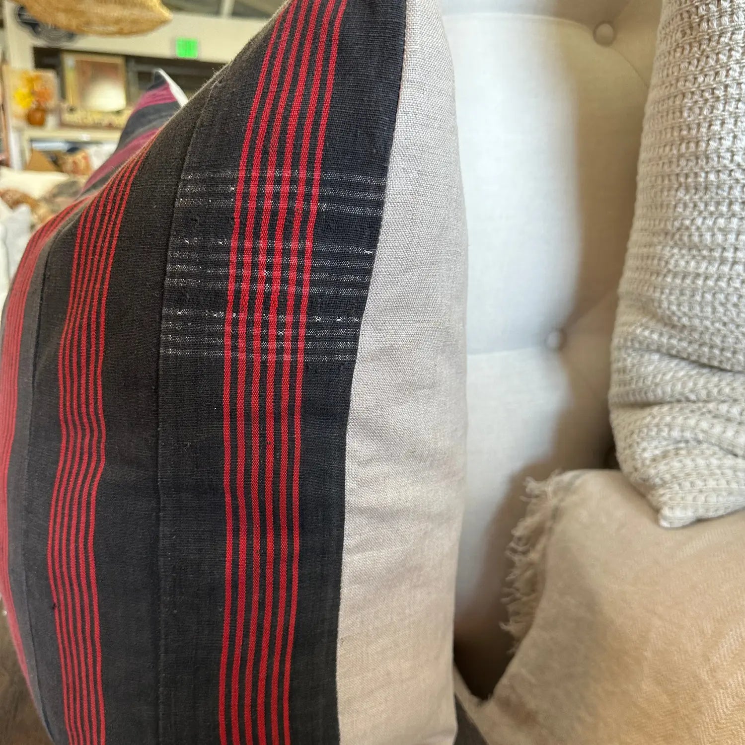 Vintage red & black striped with white dot hand blocked details. Each pillow has a slight variation. The backing is linen in a natural flax color. We recommend these be sold together and shown as a pair.