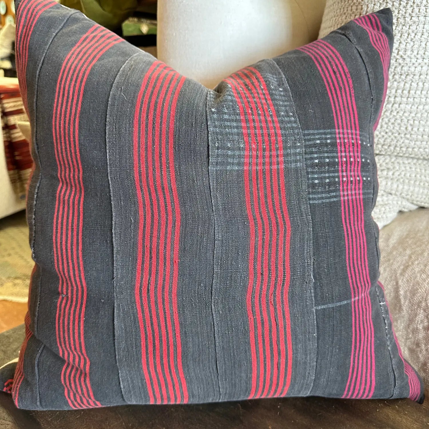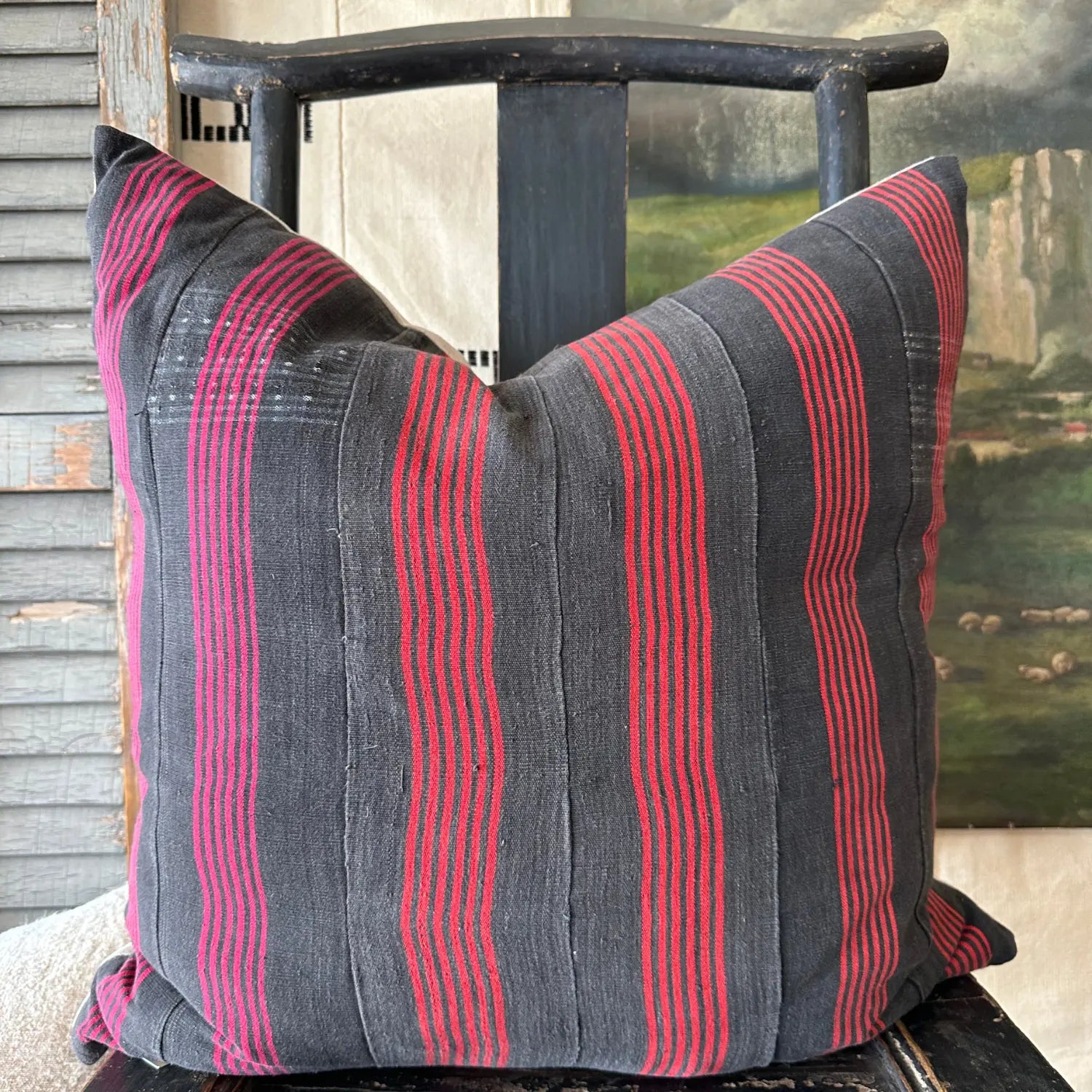 Vintage, African, fabric in cotton featuring a bold black and red stripe. Each pillow has a unique hand blocked white dot detailing. The perfect pop of red and black! Can be used on the sofa, bed or entryway bench.