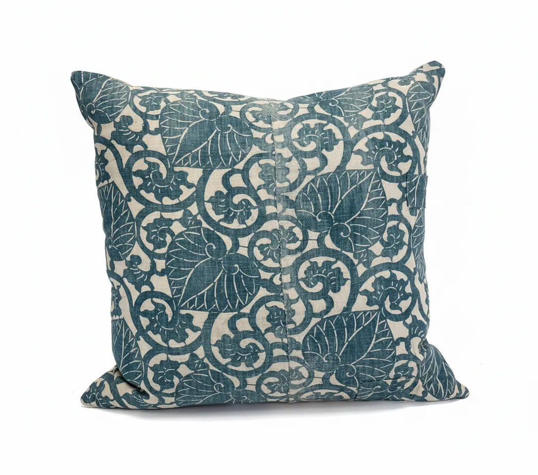 Antique Japanese Katazome Pillow in a botanical “Hollyhock” pattern – Medium blue Indigo and cream colors. This pillow features hand-stitched detailing. Zipper enclosure.