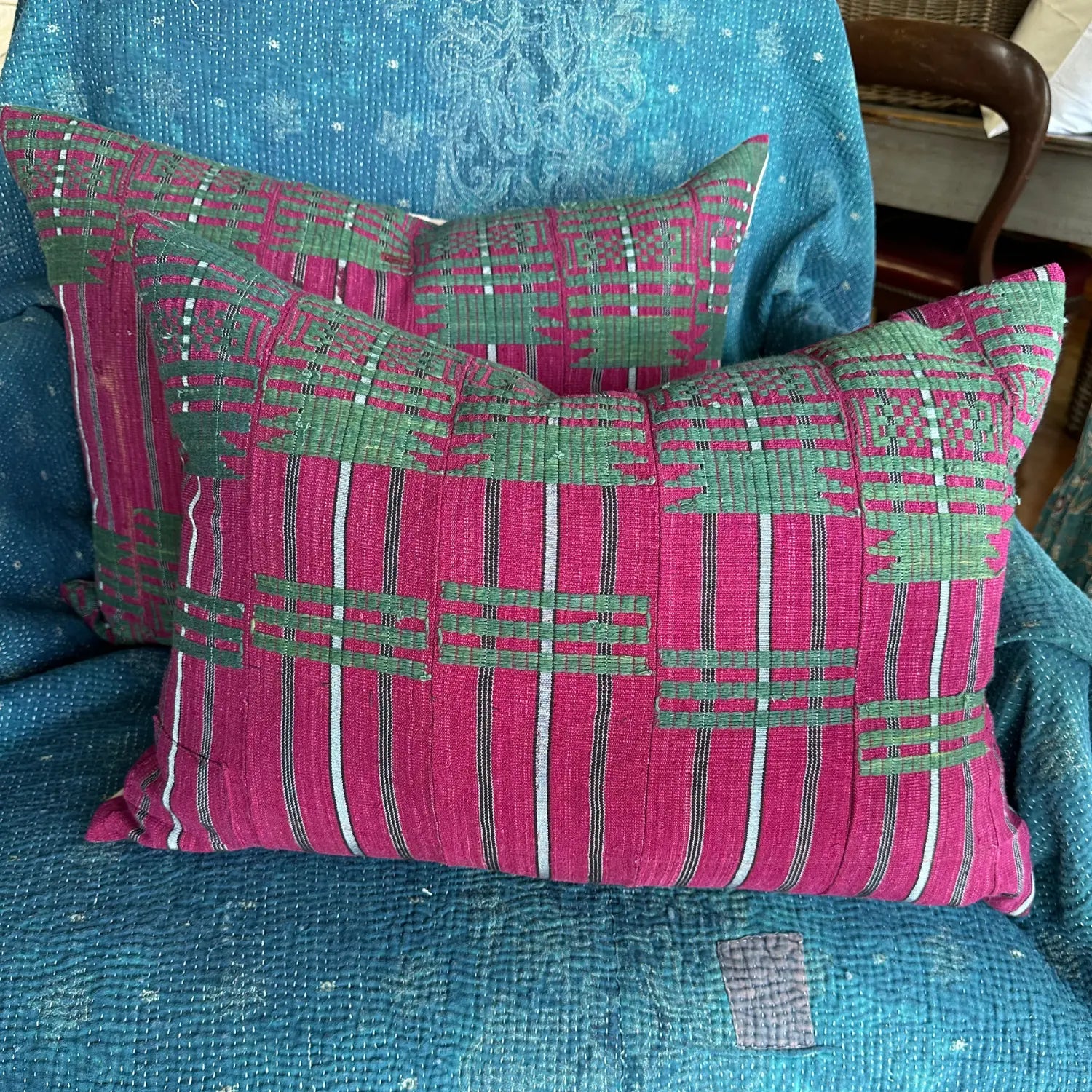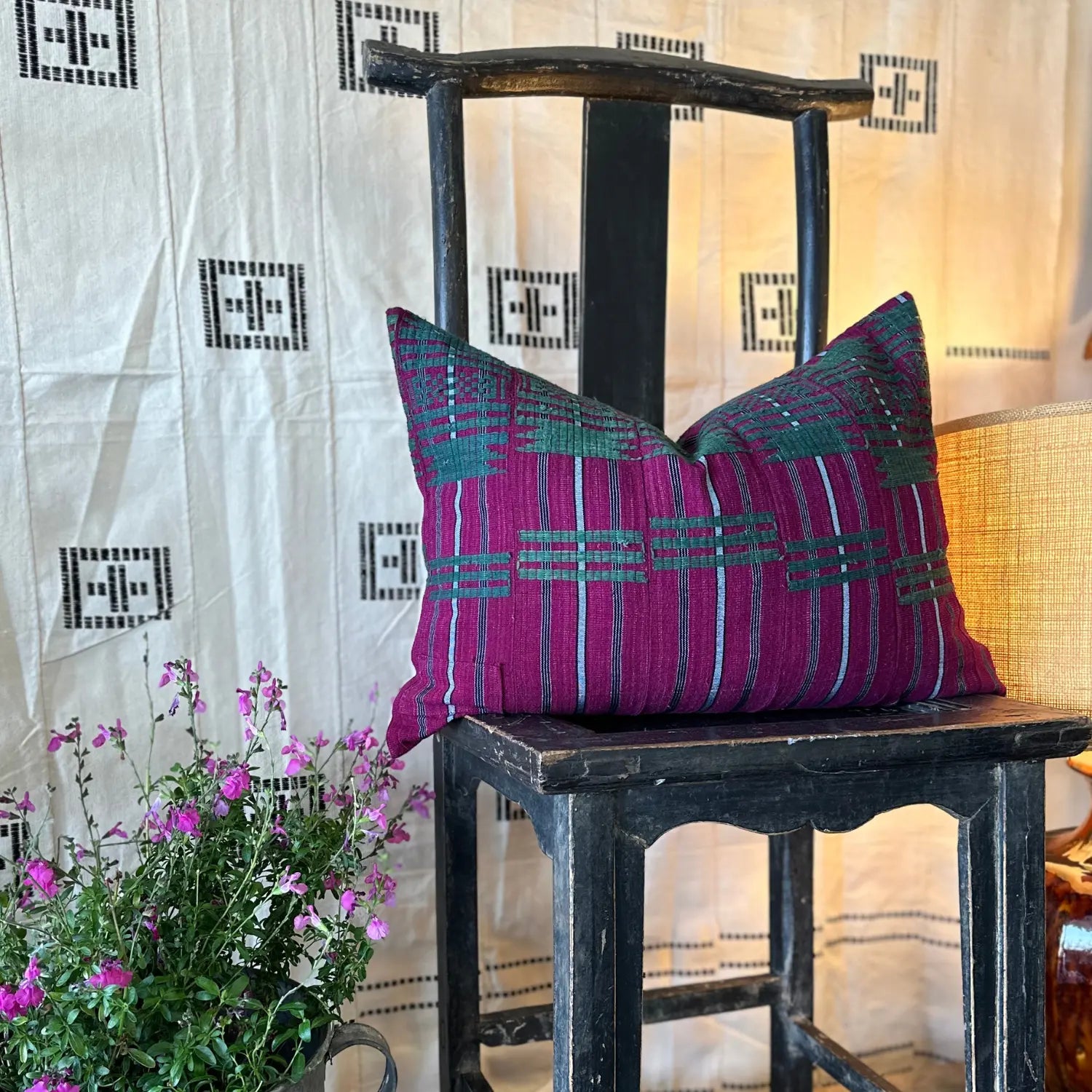 A stunning, vintage, African fabric pillow in a vibrant purple/fig ang green color combo. Featuring a woven black and white stripe detail throughout.