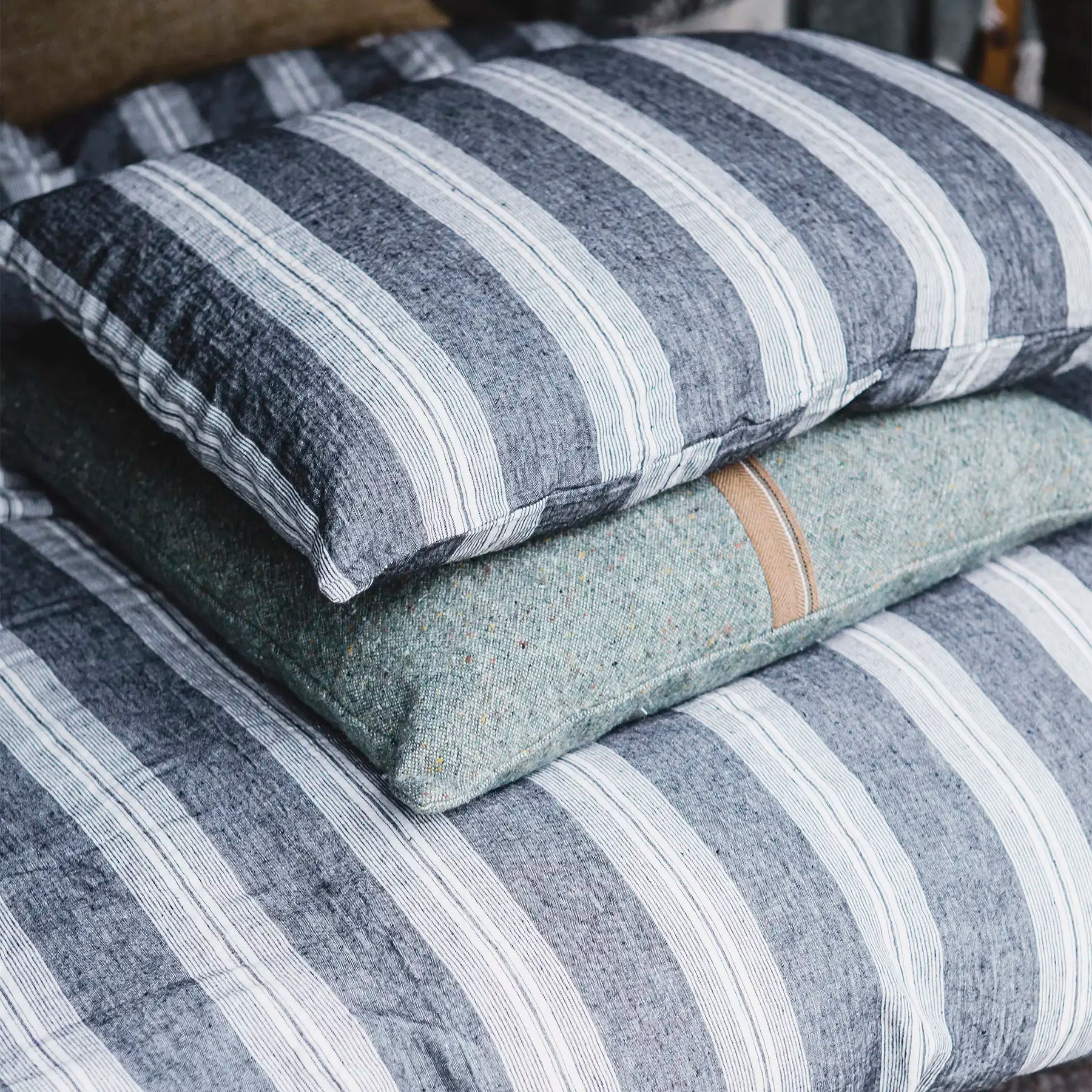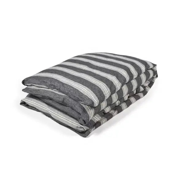 Classic striped bed linen in a pure linen herringbone. The white sand stripes sit on an off black ground. Soft linen.