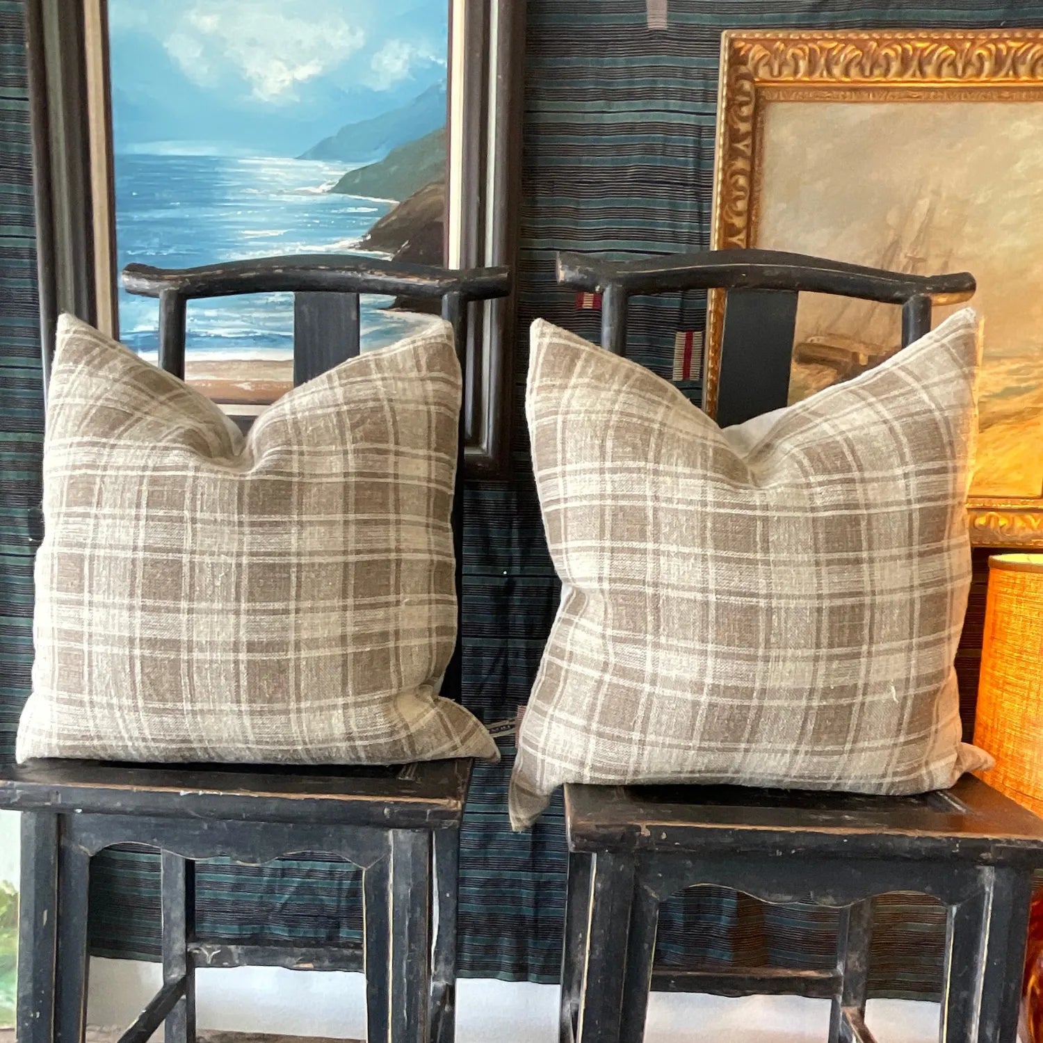 Crafted from antique Ukrainian hemp, these plaid pillows are beautifully textured with a heavy-weight fabric rich in character and history. Each piece is backed with a light tan linen for a soft, natural contrast and finished with a hidden zipper closure.