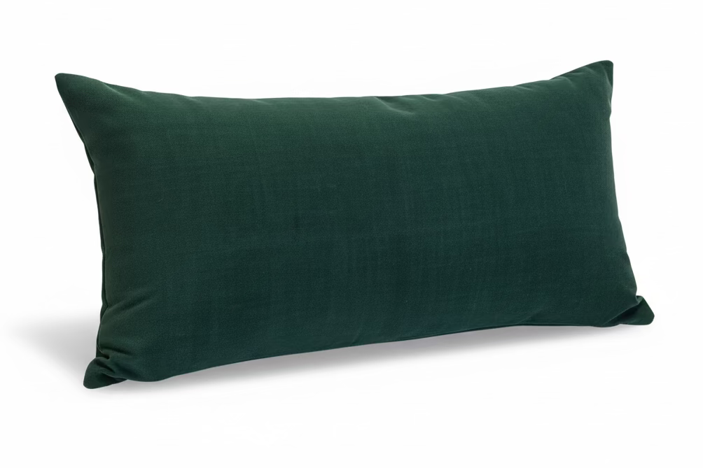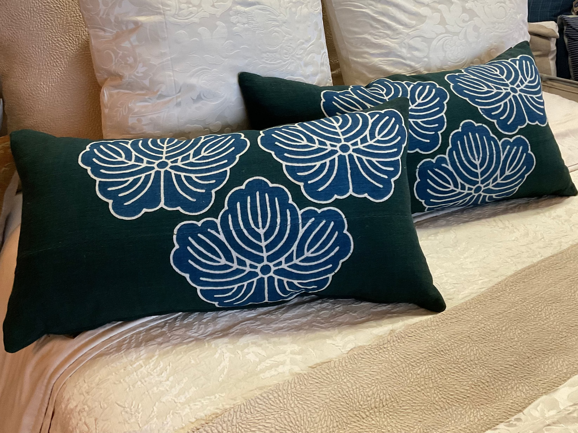 Vintage lumbar pillow made from a heavy netting fabric featuring a deep green & blue with white family crest.