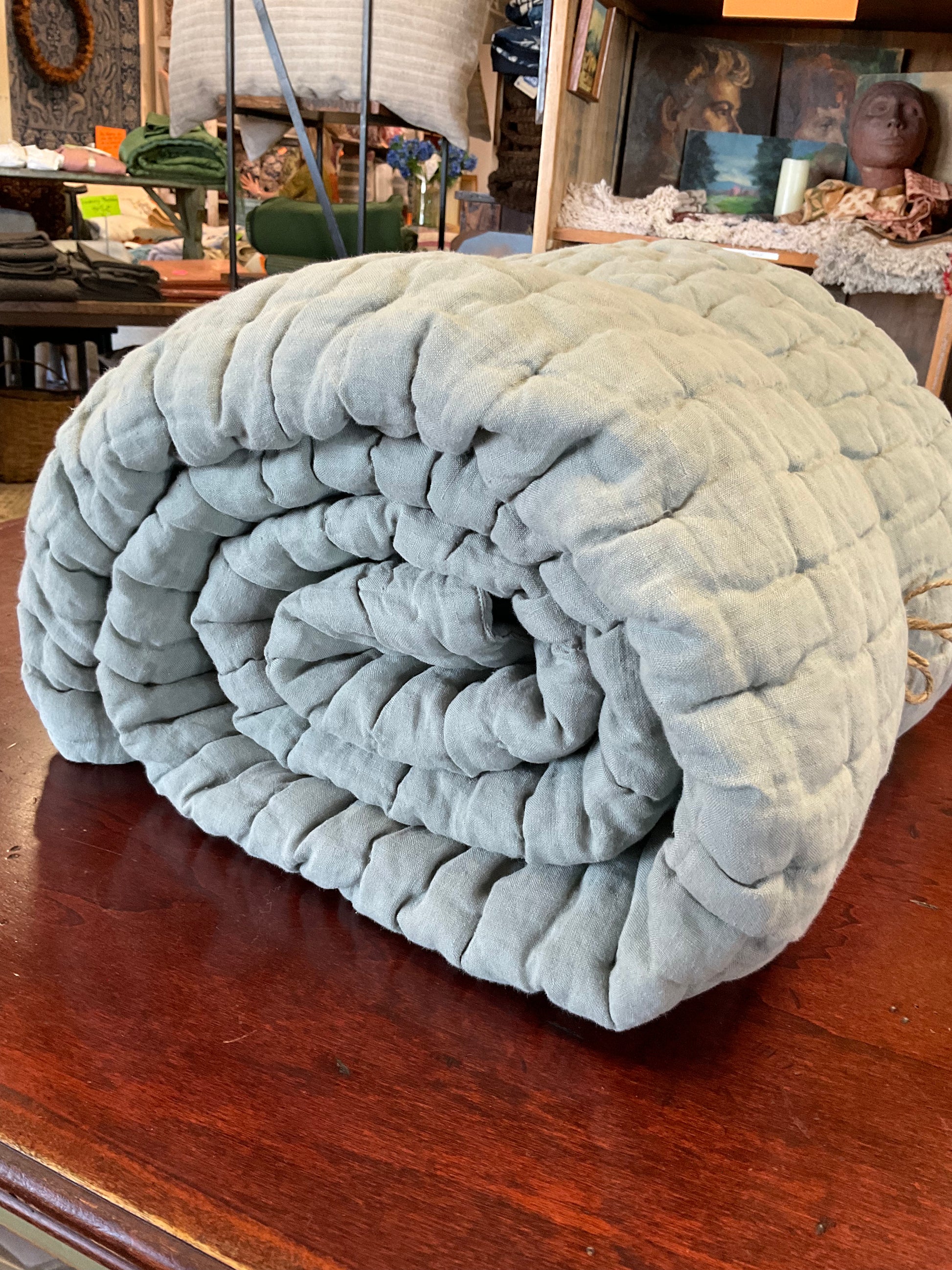 By Once Milano, the effect of the wavy blanket was made using sewing, creating waves that enhance the play of light on linen and create the visual effect of a range of shades of the color of the linen.
